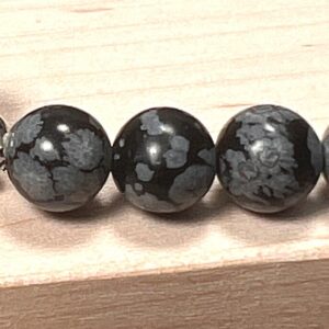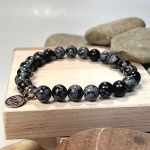 This genuine Snowflake Obsidian gemstone bracelet features deep black stones with natural grey or white patterns that resemble delicate snowflakes scattered across the surface. These striking markings give each bead its own character, creating a bracelet that can be worn on its own or stacked with other gemstone bracelets.